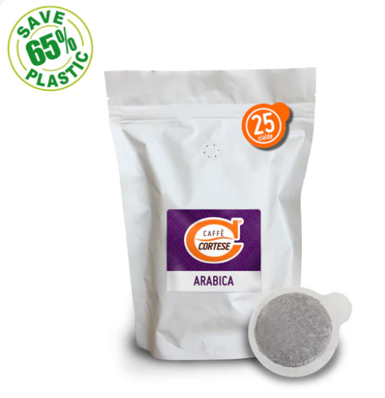 Per ridurre al minimo i consumi della plastica ci sono le nostre Cialde Caffè Cortese compostabili ESE 44 mm confezionata in Doypack da 25 pz.