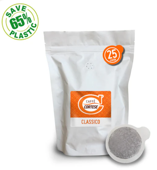 Per ridurre al minimo i consumi della plastica ci sono le nostre Cialde Caffè Cortese compostabili ESE 44 mm confezionata in Doypack da 25 pz.